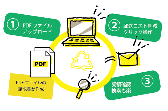 「長3封筒で郵送されている業務をメールアップロードに置き換える」流れになるので、請求書のPDF作成が必要となります